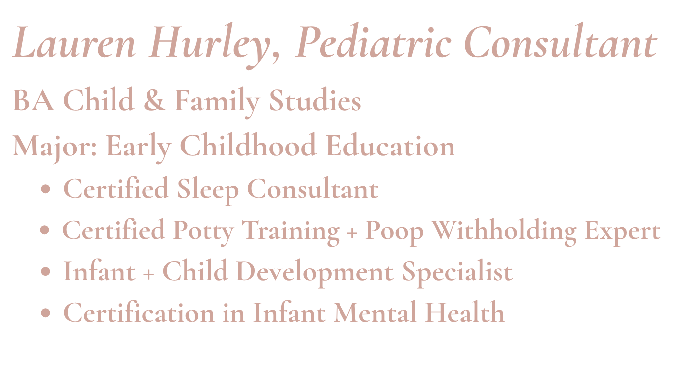A mom to three sweet little boys, and a Pediatric Consultant who specializes in sleep, toileting and child development. I have a B.A. in Child and Family Studies with a major in Early Childhood Education, and I’m a Certified Sleep Consultant, Certified Potty Training Expert, and hold a certification in Infant Mental Health. I have 15 years of hands-on experience as an Infant & Child Development Consultant supporting families of children who are neurotypical and neurodivergent who are at risk for a developmental delay or showing signs of a developmental delay. Plus over 20 years working in pediatrics.